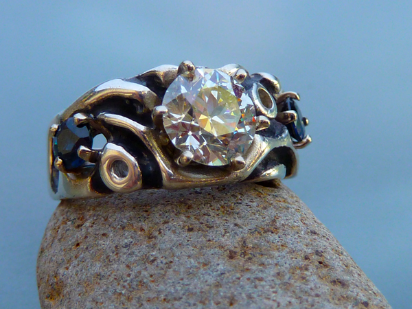 The ring has two sapphires and a diamond and was originally in a classic setting. Matagi’s magic turned it into something completely modern and completely original.