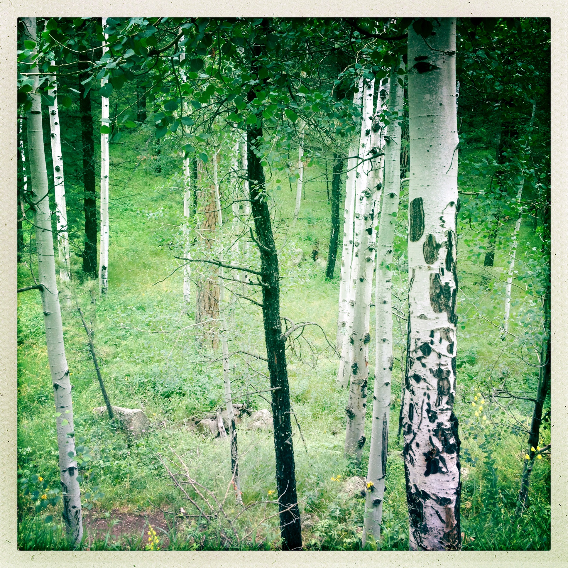 There were quite a few people out, enjoying the trails. It’s a wonderful place! But, I had the intense need to be alone today, so I bypassed some of the singletrack by riding the road for a bit. Looking down through the aspen, I can see singletrack. When I ride the singletrack, I’m aware of the road occasionally in the background, but I never notice being that close to the road.