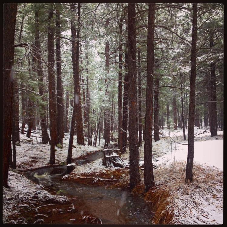 forest in warm snowfall – trails turn to streams – pine needles beneath our feet