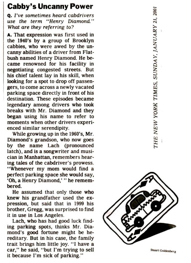 I must have mentioned parking angels during a conversation with my friend Lach. He told me the story of his grandfather, Henry Diamond, a cab driver from Flatbush. Henry was famous among cab drivers, and a perfect parking spot became known as a “Henry Diamond.”